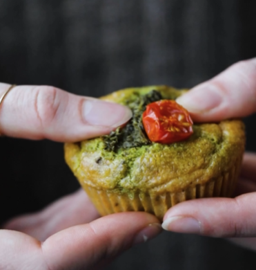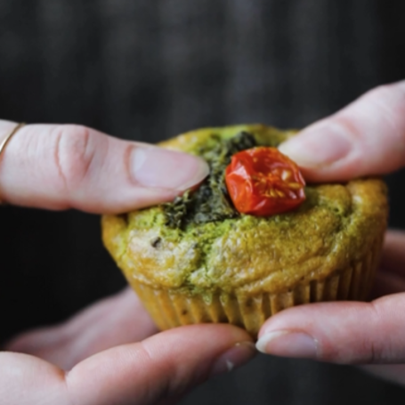 Madmuffins er et supergodt mellemmåltid og perfekt at have med på tur. Disse madmuffins er glutenfrie og toppes med pesto og tomat.