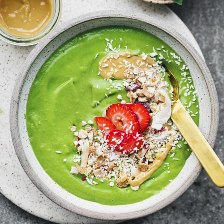 Smag til og tilsæt mere syre eller sødme efter behov. Hvis du vil drikke din smoothie, kan du hælde lidt ekstra væske i fra kokosmælken, så konsistensen bliver tyndere.