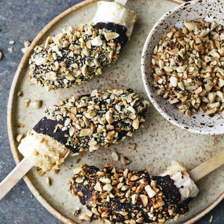 Tag bananerne ud af fryseren og dyp dem først i jordnøddesmør, lad dem sætte sig i et par minutter, og dyp dem derefter i den smeltede chokolade, og vend dem derefter direkte til de hakkede nødder. Spis med det samme, eller læg det tilbage i fryseren, og tag dem ud som en hurtig snack.