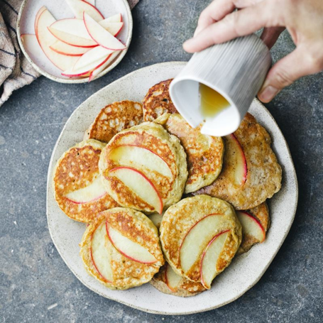 Disse æblepandekager er en sundere glutenfri variant af tykke amerikanske bananpandekager med æblepuré i stedet for banan. Hurtig morgenmadspandekager, der smager lækkert om efteråret.